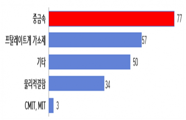 지난해 실시한 검사 결과를 살펴보면, 가장 많이 검출된 유해 성분은 납·카드뮴 등 ‘중금속’이었다. 장신구, 신발, 화장품 등에서 주로 초과 검출됐으며 총 77건에서 확인됐다.